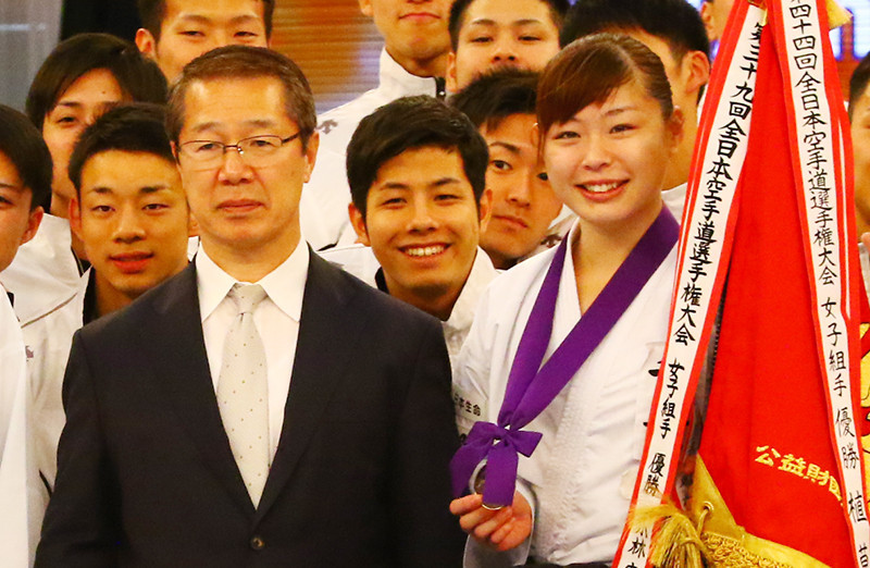 香川政夫師範(左)と植草歩=17年全日本選手権にて