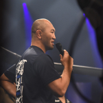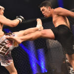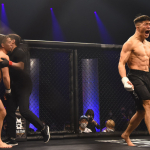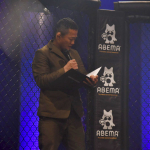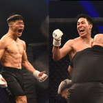 新井(左)からTKO勝利し、雄叫びを上げる中村倫也(右)