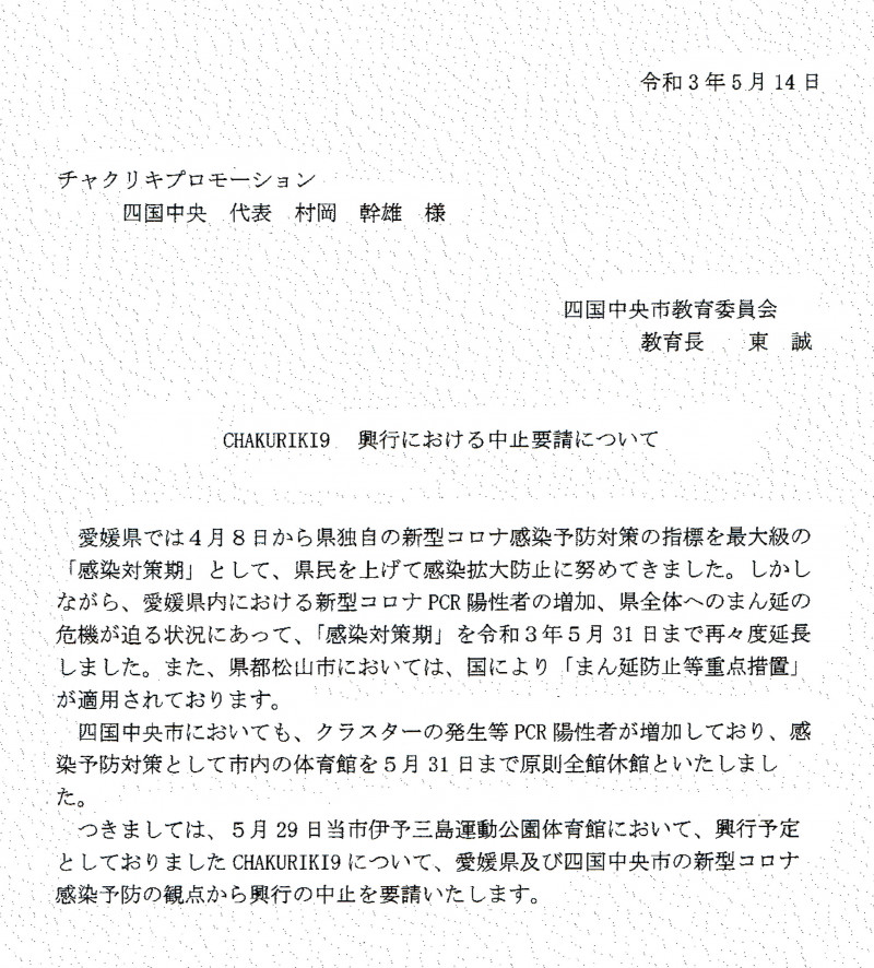 愛媛県四国中央市から届いた中止要請書