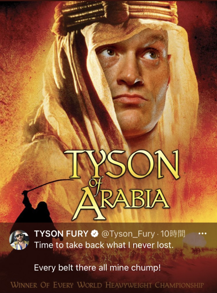 何としてもジョシュアとやる気満々映画『アラビアのロレンス』の自身の合成画像まで作ったフューリー。 (@Tyson_Furyより)