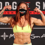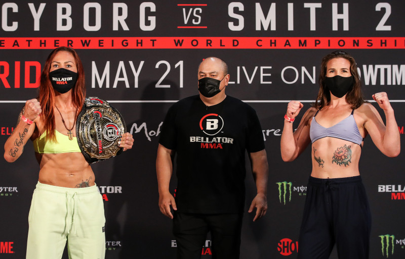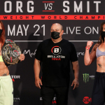 ベルトを肩にかける王者サイボーグ(左)と挑戦者のスミス(右)©️Bellator