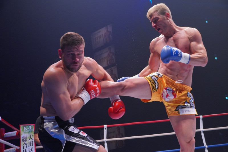 加藤(左)にミドルキックを効かせるサッタリ(右)