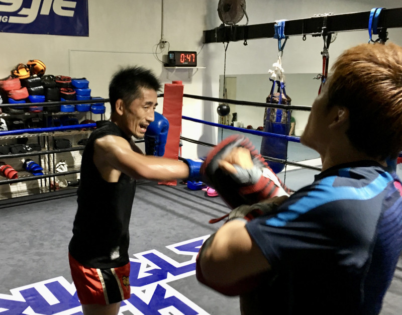 師匠の鈴木秀明氏の持つミットにパンチを打ち込む松﨑=18年