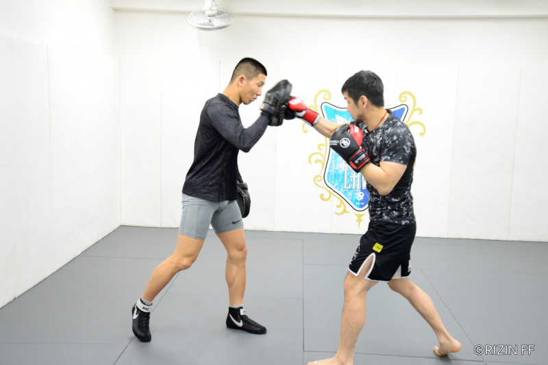 普段とは違う右構えから近距離で、ワンツーを打ち込む石渡