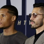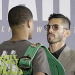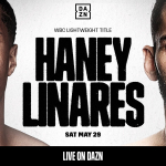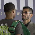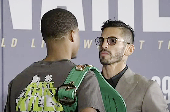 リナレス(右)と王者ヘイニーが本日28日(日本時間)会見でフェイスオフで睨み合う(C)DAZN