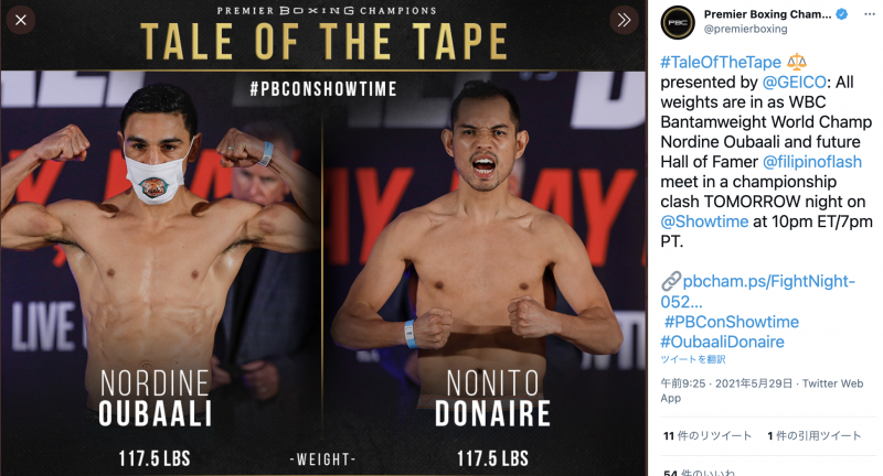 ドネアが野獣顔で計量パス。ウバーリもドネアと同じ体重でパスした(@premierboxingより)