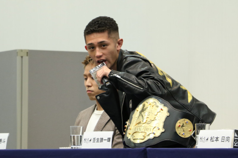 会見場の机から身を乗り出しながら大仁田愛を叫ぶ壬生狼一輝