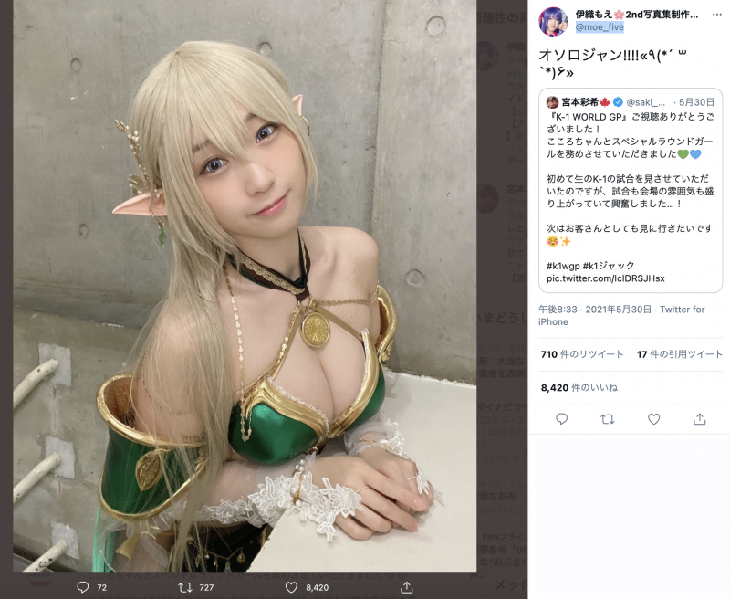 大人気コスプレイヤーの伊織もえ「オソロジャン!」とツイート。写真にあるように多くのいいねやリツイートなど反響があった(@moe_five)