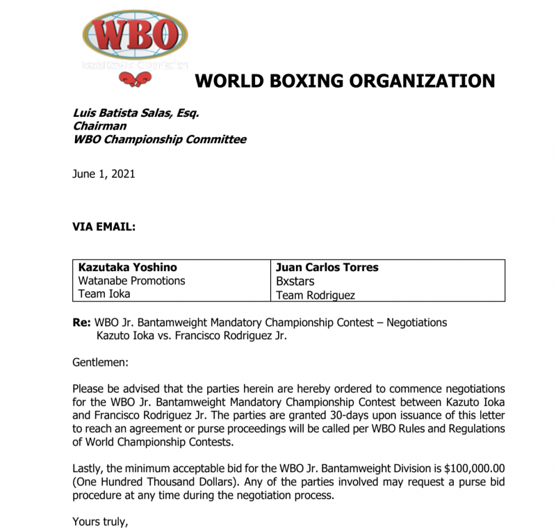 本日WBOが発表した井岡への対戦指令書