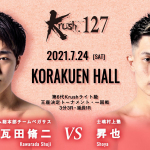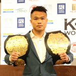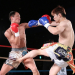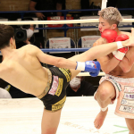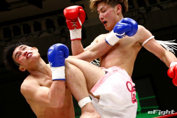 飛びヒザでダウンを奪う里見(2018年5月)