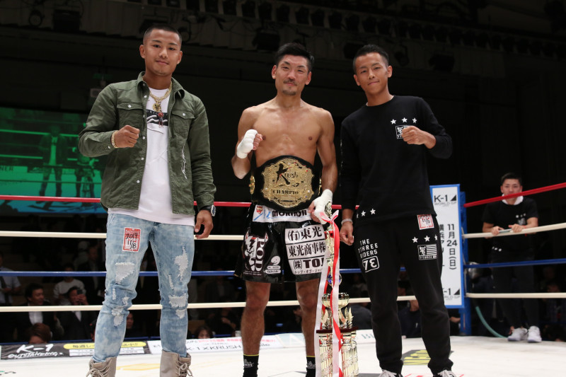 19年11月にはKrush王座を戴冠した佐々木(中央)江川優生(左)と現在はボクシングに転向した武居由樹(右)に祝福される