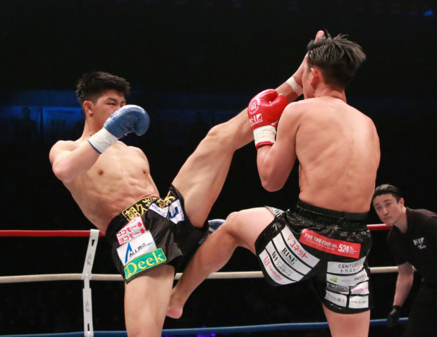 朝久の上段前蹴りが王者(当時)林健太の顔面を捉える瞬間