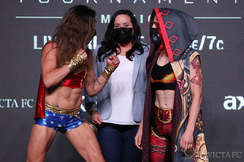 『ワンダーウーマン』のコスプレのリンジー(左)とペレス力強いフェイスオフ(C)=INVICTA