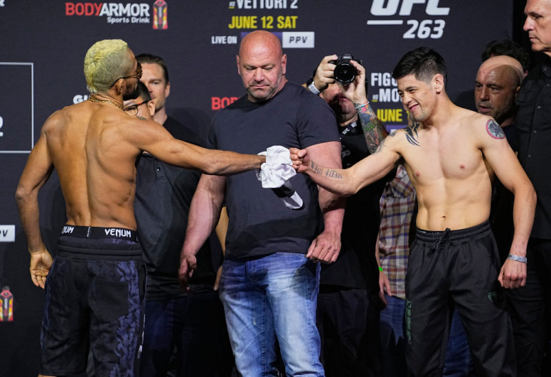 フェイスオフで拳をぶつけるフライ級王者フィゲイレード(左)と挑戦者モレノ(右)@UFC