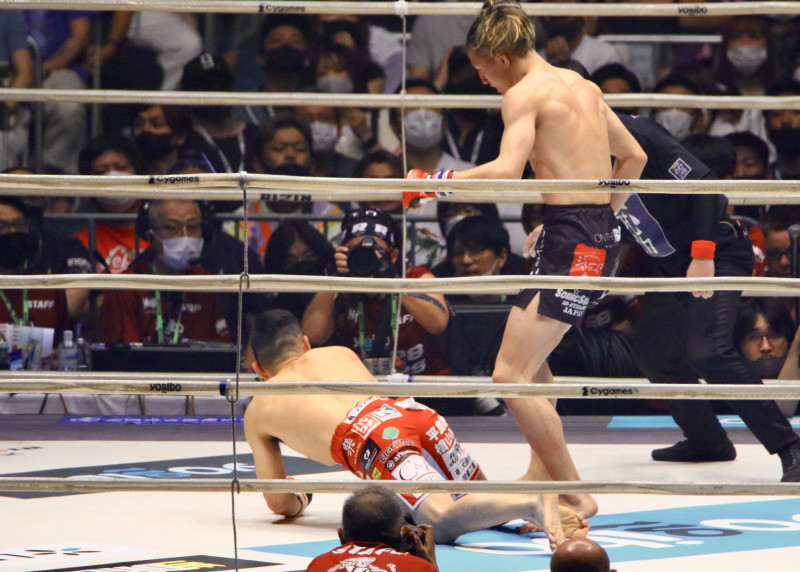井上のサッカーボールキックを受け、崩れ落ちる石渡