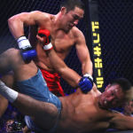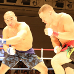 KNOCK OUTラウンドガールを務めるグラドル来栖うさこ(左)と、独特な世界観を持つ佐藤光留(2007年11月)