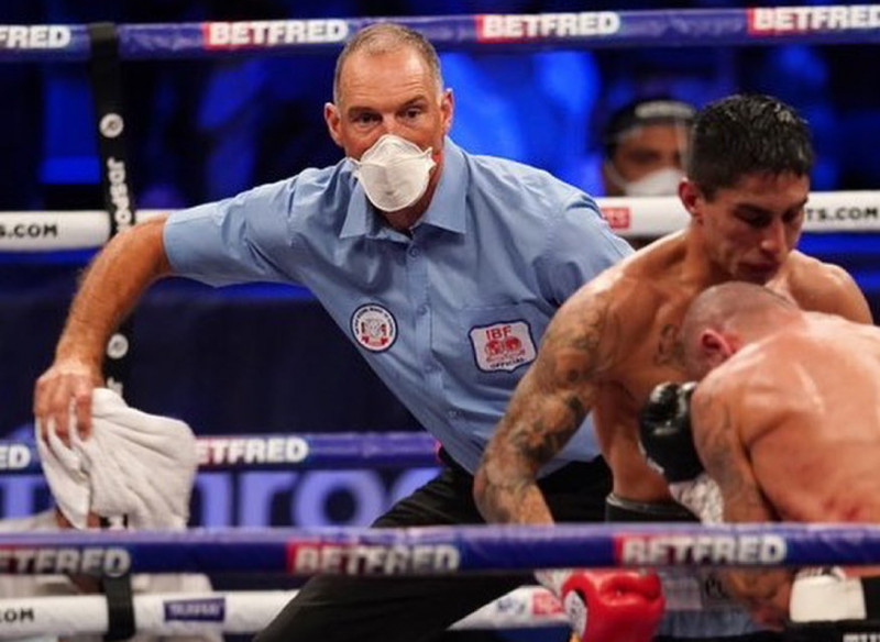 投入されたタオルを無視し、リング外に投げようとするレフェリー(c)DAZN