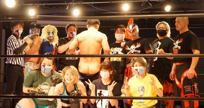 カード発表3日前、プロレス興行で佐藤(後列中央)を笑顔で見つめる鈴木(後列右端)/(提供写真)