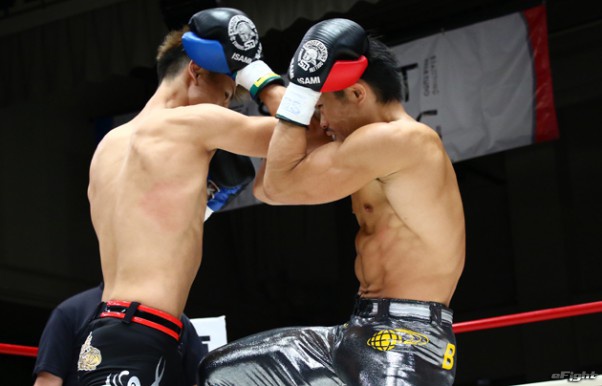 ガードの隙間からヒジを炸裂させる海人(2017年6月)