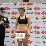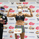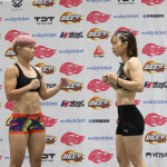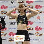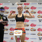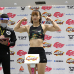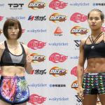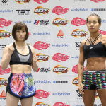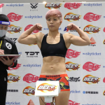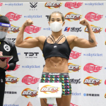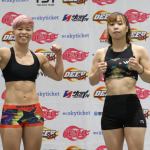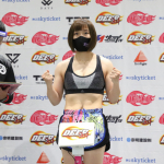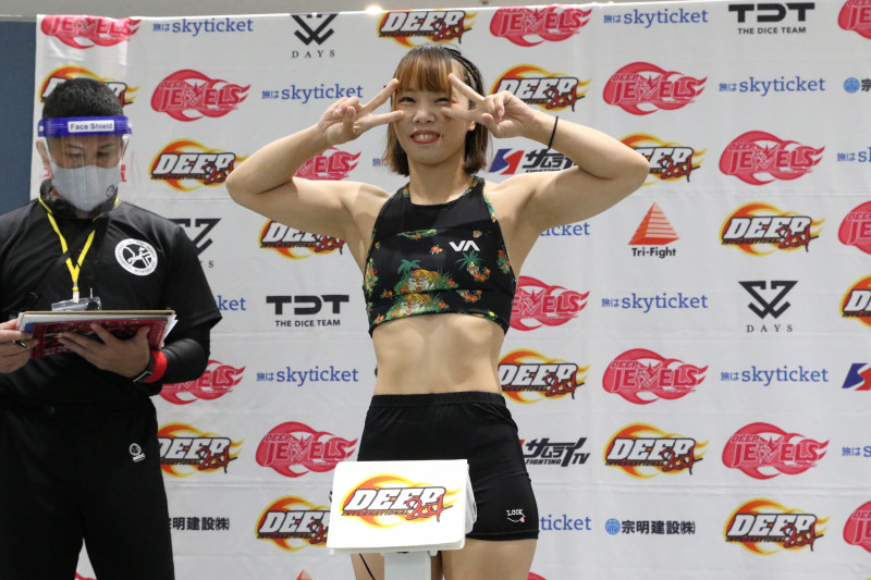 笑顔で計量パスの青野がトレードマークのダブルピース