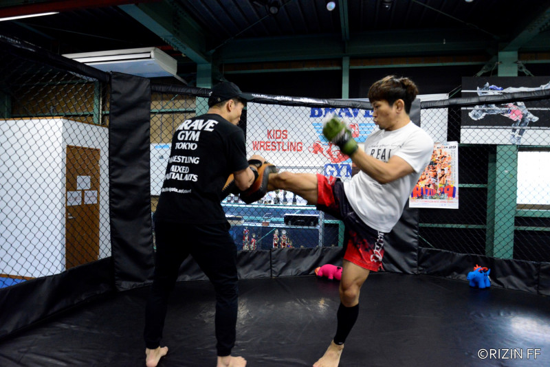 キレのあるミドルを、宮田会長が持つミットに蹴り込む伊藤