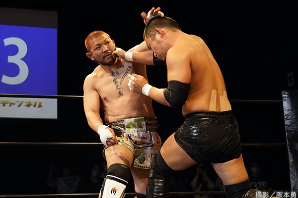 U系プロレスにも初挑戦した渡慶次(左/2021年4月©ハードヒット実行委員会)