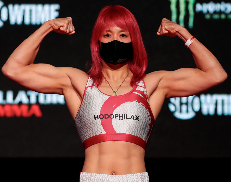 ベラトール2戦目に挑む渡辺華奈が計量パスしマッスルポーズ、肩周りと広背筋は相手を凌ぐ©️Bellator