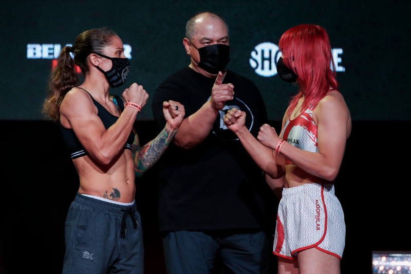 間に入るコーカー社長は正面に向かうように促すが、両者は無視©️Bellator