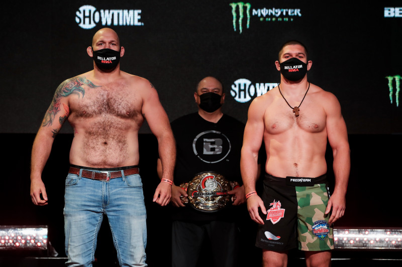 ジョンソン(左)とモルダフスキー(右)が並ぶ。ジョンソンの身体が一回り大きい©️Bellator
