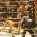 白鳥の右フックで皇治がダウン、マットに手をつく