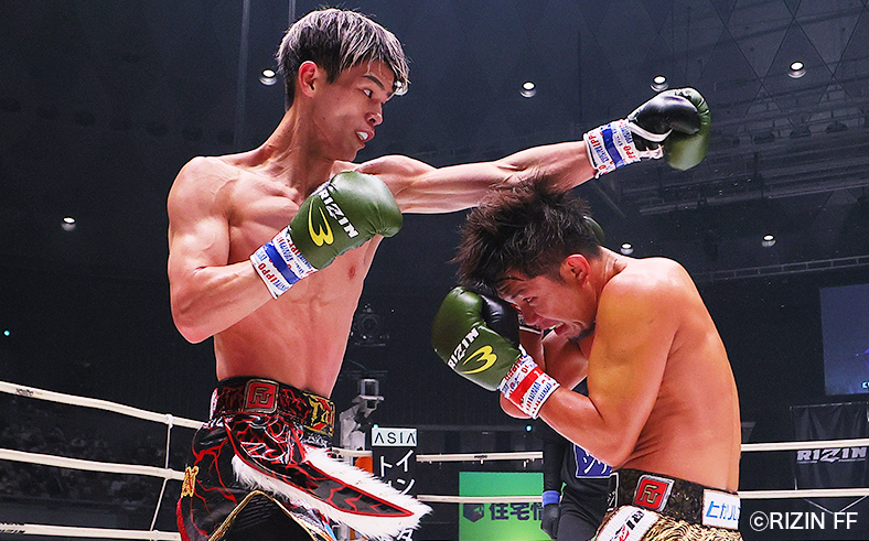 白鳥のパンチを頭を低くしてかわす皇治