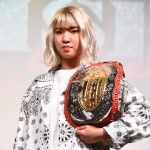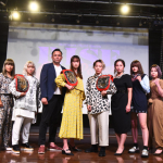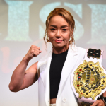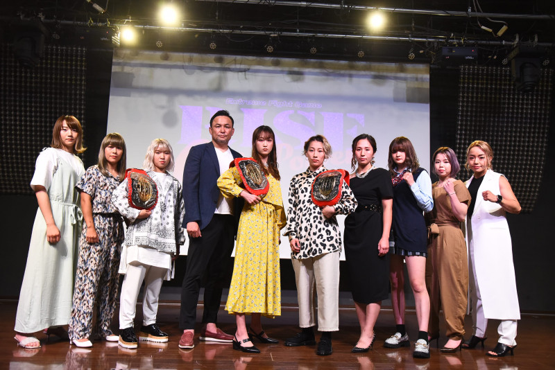 会見に出席した(左から)村上悠佳、平岡琴、宮﨑小雪、RISE伊藤隆代表、寺山日葵、小林愛三、神村エリカプロデューサー、AKARI、奥脇奈々、YAYAウィラサクレック