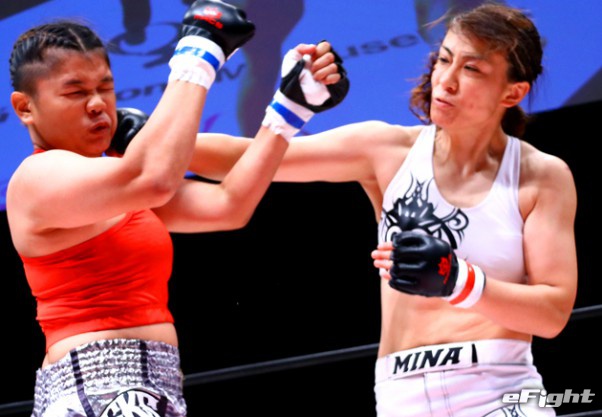 18年のGirls S-CupではMMAルールで、1R右ストレートでTKO勝ちした未奈(右)