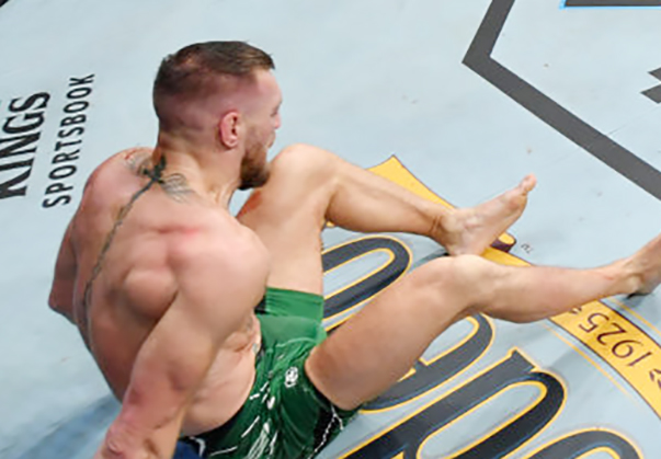 マクレガーの左足のスネ下部が曲がり、立てなくなるマクレガー(C)Getty/UFC