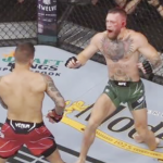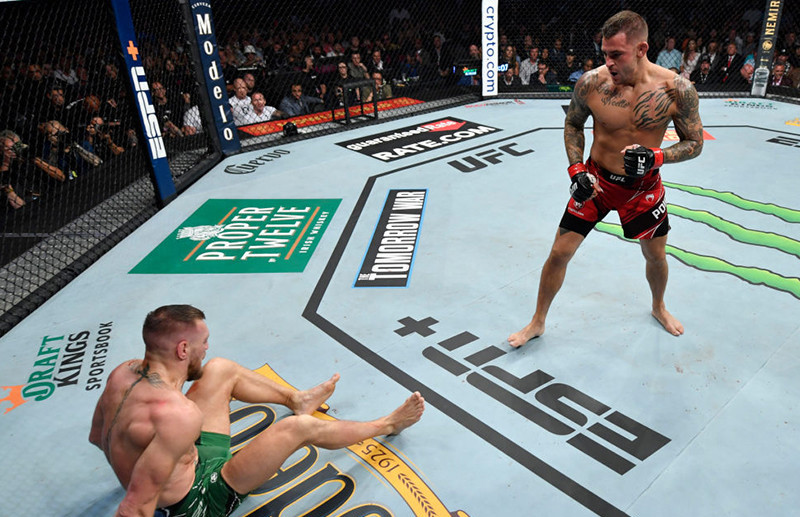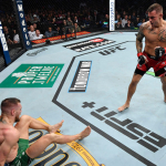 マクレガーがラウンド終了間際に左足のスネを骨折し立てず、ドクターストップになった( C)Getty/UFC