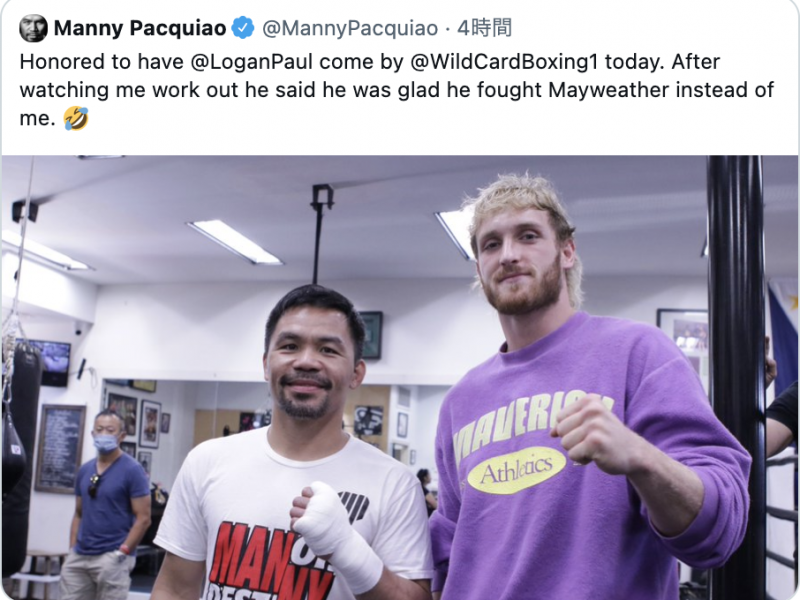 パッキャオ(左)のライバル、メイウェザーと戦ったローガンポールがパッキャオの練習を視察(パッキャオのTwitterより)