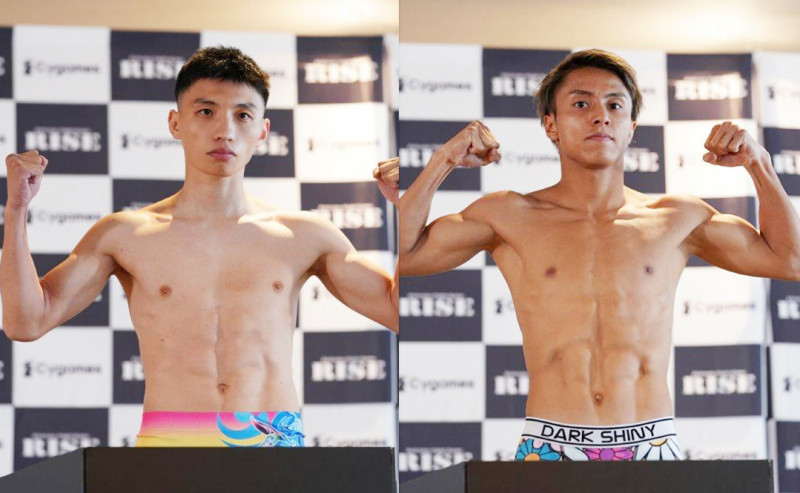 メインのRISEスーパーフライ級王者・大﨑一貴(左)とIBFムエタイ世界フライ級王者・石井一成が計量パス
