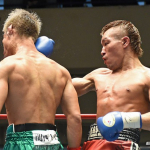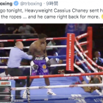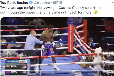 ヘビー級のパンチで場外へ吹っ飛ばされた相手(TOPRANKツイッターより)