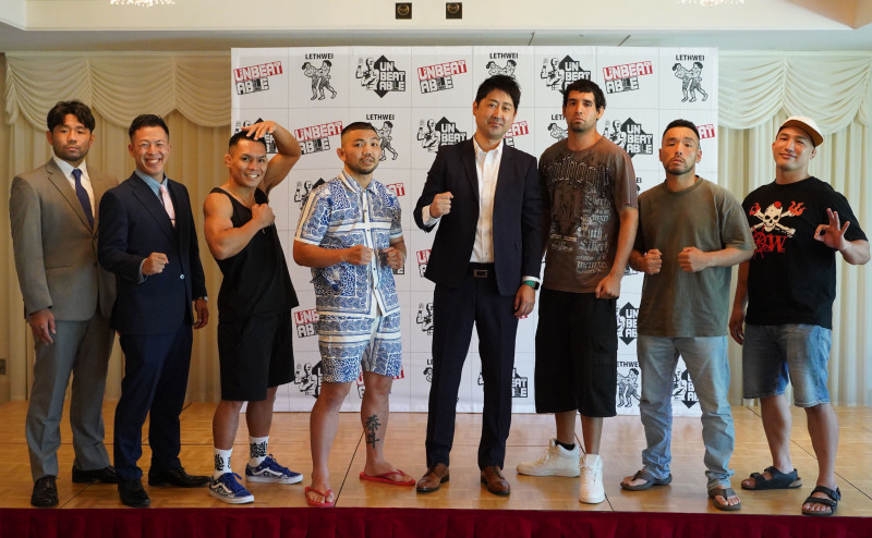 左から坂本、右乳、東、渡慶次、右から鈴木、伊藤、ジョナタン。右から4番目はラウェイのプロモーター清水覚男氏©FOS