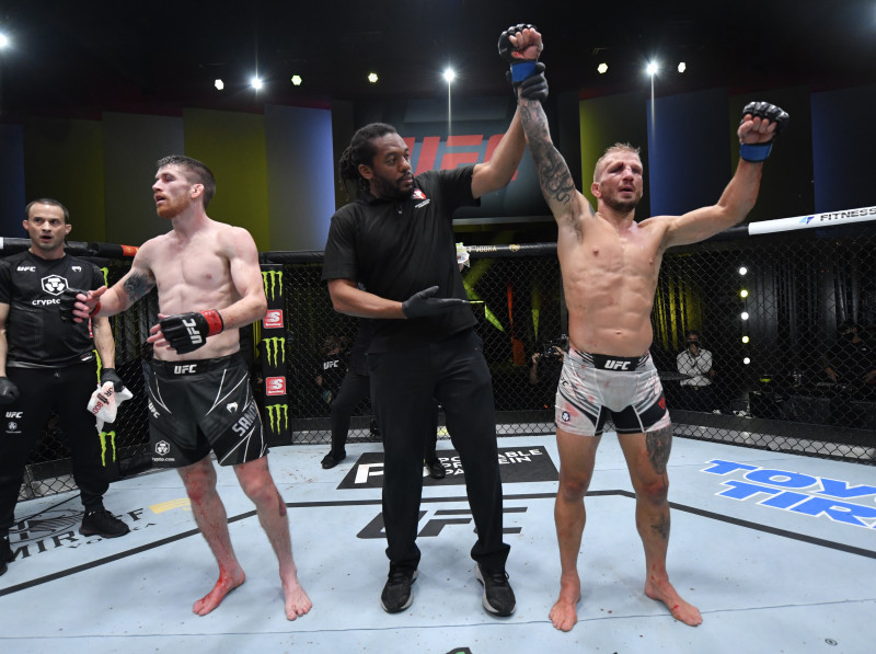 2年半ぶりの復帰戦で勝利した元王者ディラショー(右)(©Getty Images/UFC)