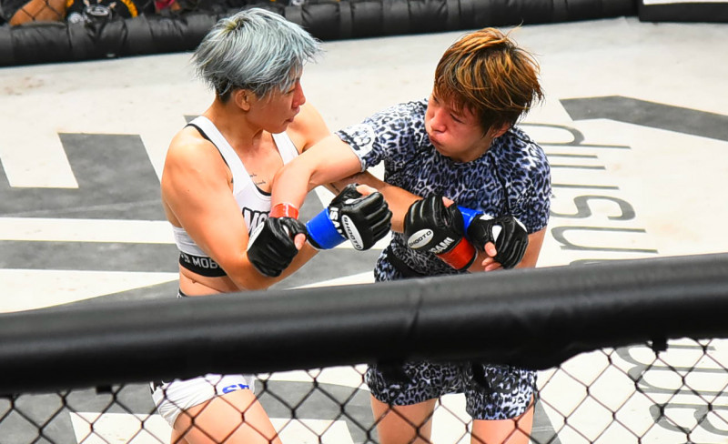 黒部未奈(右)と打撃戦を繰り広げる杉本(20年8月)