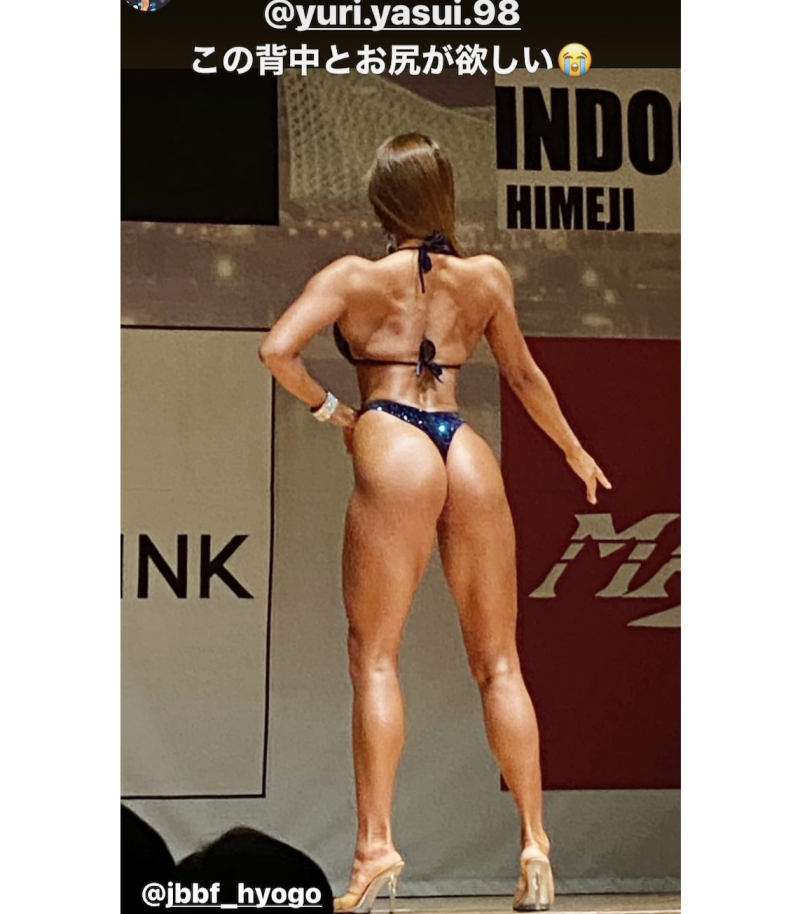 良く見ると安井の背中の筋肉がすごい。さらにクビれたウエスト、ヒップの大きさ、鍛えられた賜物だろう(安井友梨のブログより引用)