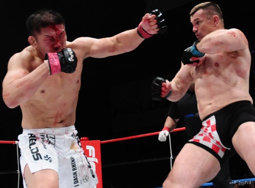 14年8月のミルコ・クロコップ戦ではヒジ打ちで額から流血、TKO負けした石井(左)。現在はミルコのもとで練習している