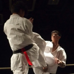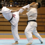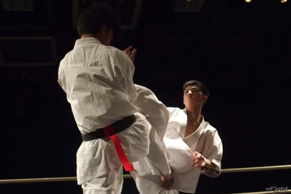 空手のライバルだった福地勇人に前蹴りを繰り出す小野寺(右)=16年