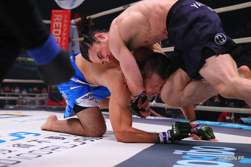 グラウンドのヒザ蹴りをガッツリ当てる矢地