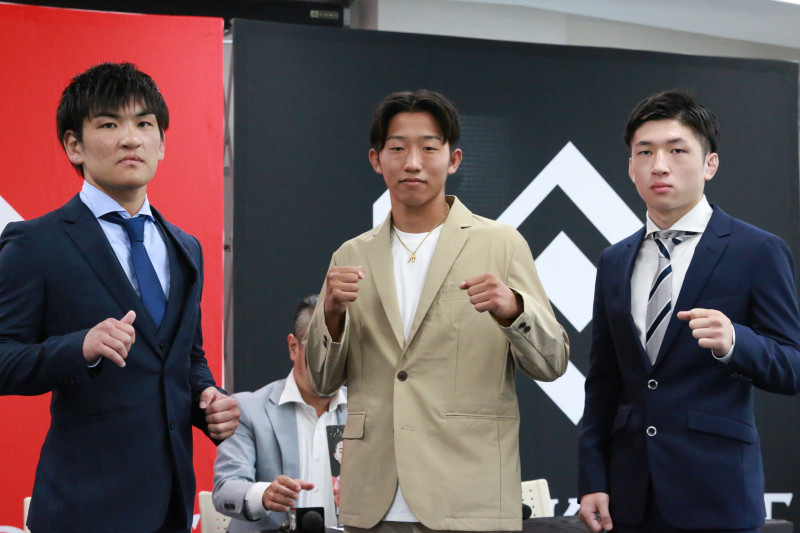 初代KNOCK OUT-BLACKスーパーフライ級王座を争う(左から)濱田、花岡、心直。もう1名の空龍は会見を欠席