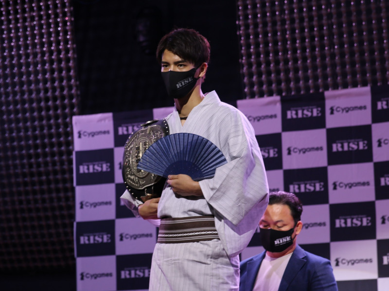 ベルトと扇子を手に、浴衣姿で会見に登場した白鳥