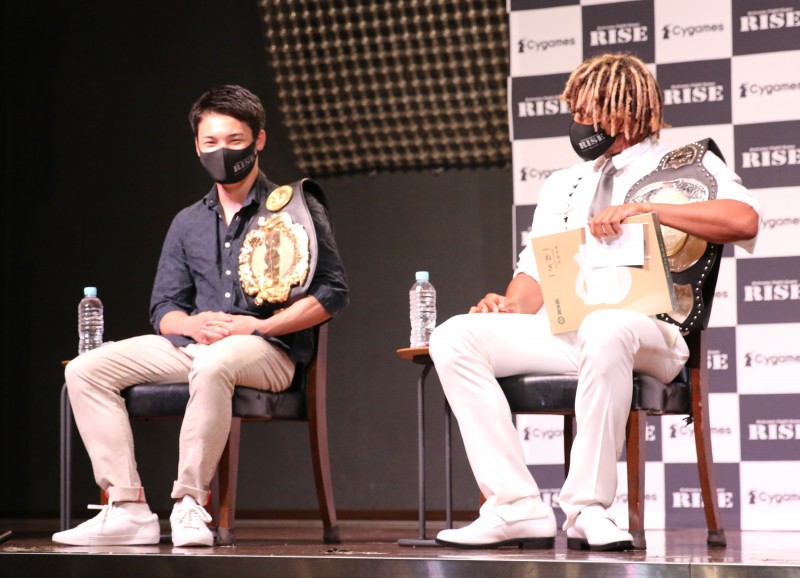 同大会の会見に出席した大﨑孔稀(左)は、かつて同門だったねぎ魔神を応援するとコメント