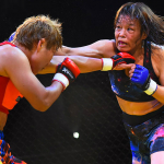 元ボクシング世界3階級王者のライカを、パンチで攻めていく端(右)