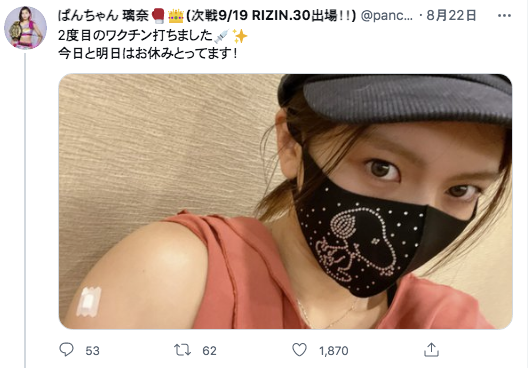 新型コロナワクチン接種で右腕に注射の絆創膏を貼るぱんちゃん璃奈(ぱんちゃん璃奈Twitterより)